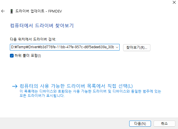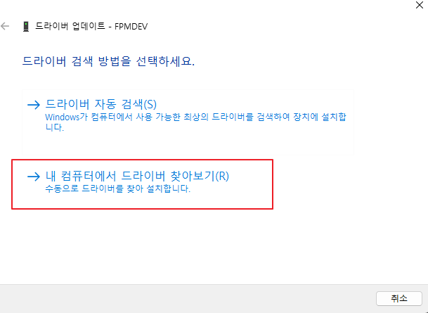 선택 창에서 "내 컴퓨터에서 드라이버 찾아보기(R)"을 선택한다.