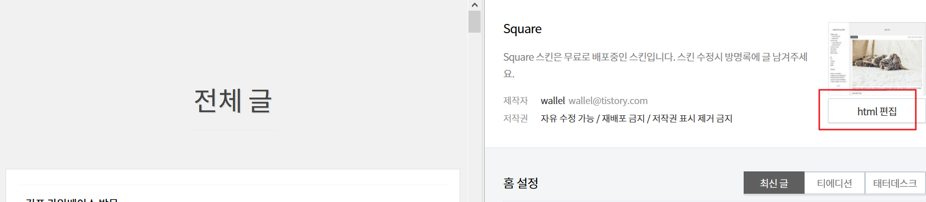 이 내용을 기반으로 Tistory 관리모드로 들어가 스킨 편집에 들어간다. 그리고 Html 편집을 클릭해서 스킨의 HTML 편집을 실행한다.