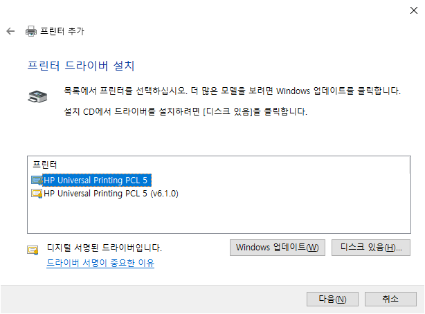 그 중에 "HP Universal Printing PCL 5"를 선택한다. 그리고 "다음"을 클릭한다.