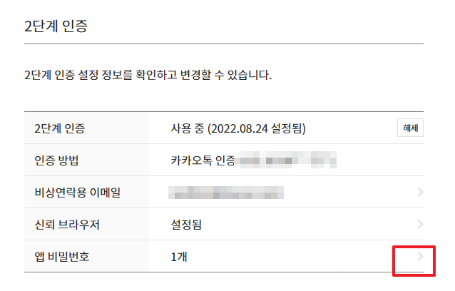 2단계 인증 화면을 보면, 무슨 요약화면 같이 나오는데, 여기서 "앱 비밀번호" 항목 끝자락에 있는 ">"를 찾아 클릭한다. 처음에는 잘못봐서 없는 줄 알고 해맸다.