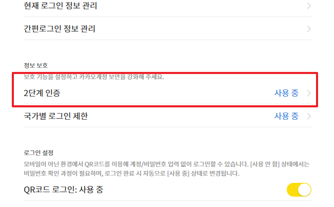 화면의 하단 쪽으로 내려보면 "2단계 인증"이라는 항목을 볼 수 있는데, 이 항목을 클릭해준다.
