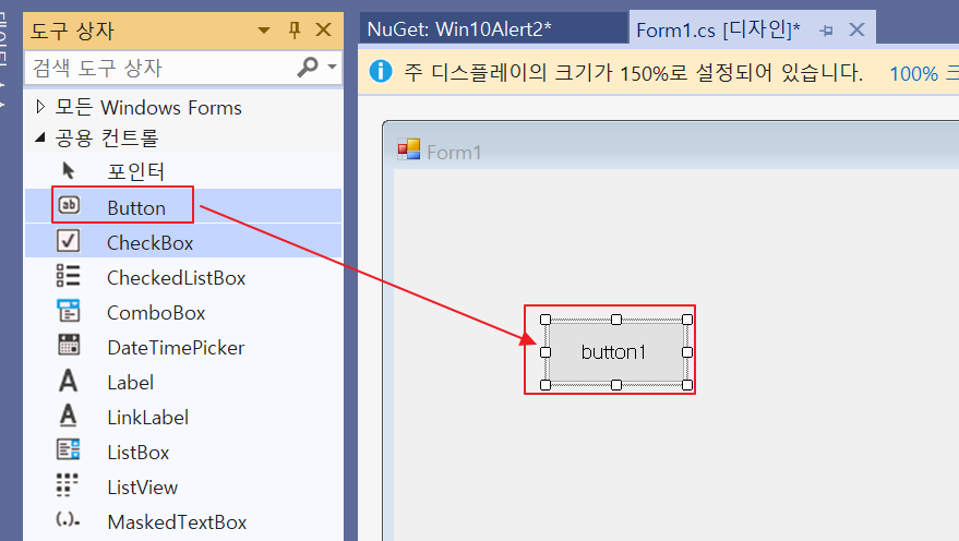 먼저 WinForm(Form1.cs)의 디자이너 화면을 띄워 Button을 추가한다.