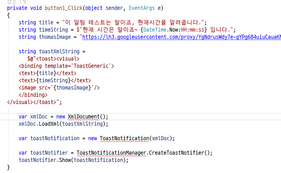 그런데 보면, XmlDocument, ToastNotification, ToastNotificationManager 등이 붉은색 글자로 참조가 안걸려 있다고 한다. 이 항목들에 대한 using을 걸어주는데, 단! 이 모든 모듈들은 Windows.UI, Windows.Data 라는 이름으로 시작되는 Namespace에서 using을 걸어야 한다. 특히 XmlDocument의 경우 System.Xml과 겹칠 수 있는데, 절대 System.Xml을 걸면 안된다!