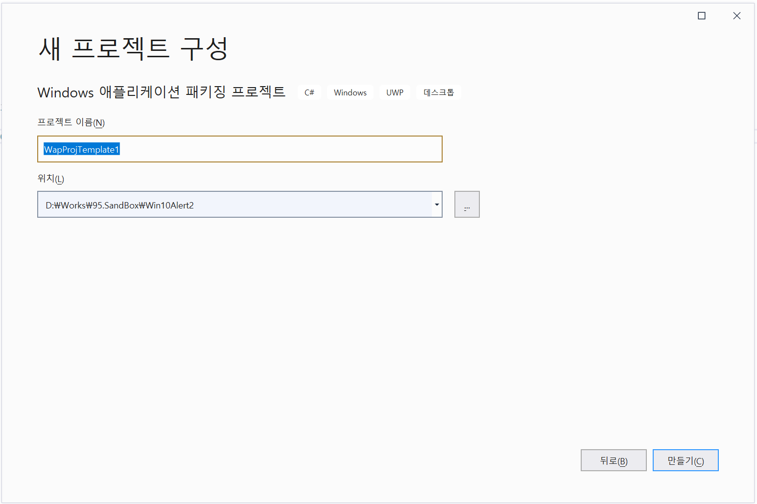 프로젝트 종류를 고르는 창이 뜨는데, 이 창의 오른쪽 위의 검색창을 이용해 "패키징" 혹은 "Packaging" 이라고 검색어를 넣으면 "Windows Application Packaging Project" 라는 항목을 볼 수 있다. 이 항목을 고르면 된다.