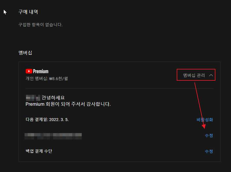 그리고 난 뒤, 멤버십 관리를 클릭 한 뒤, 결제 카드의 수정을 누르면....